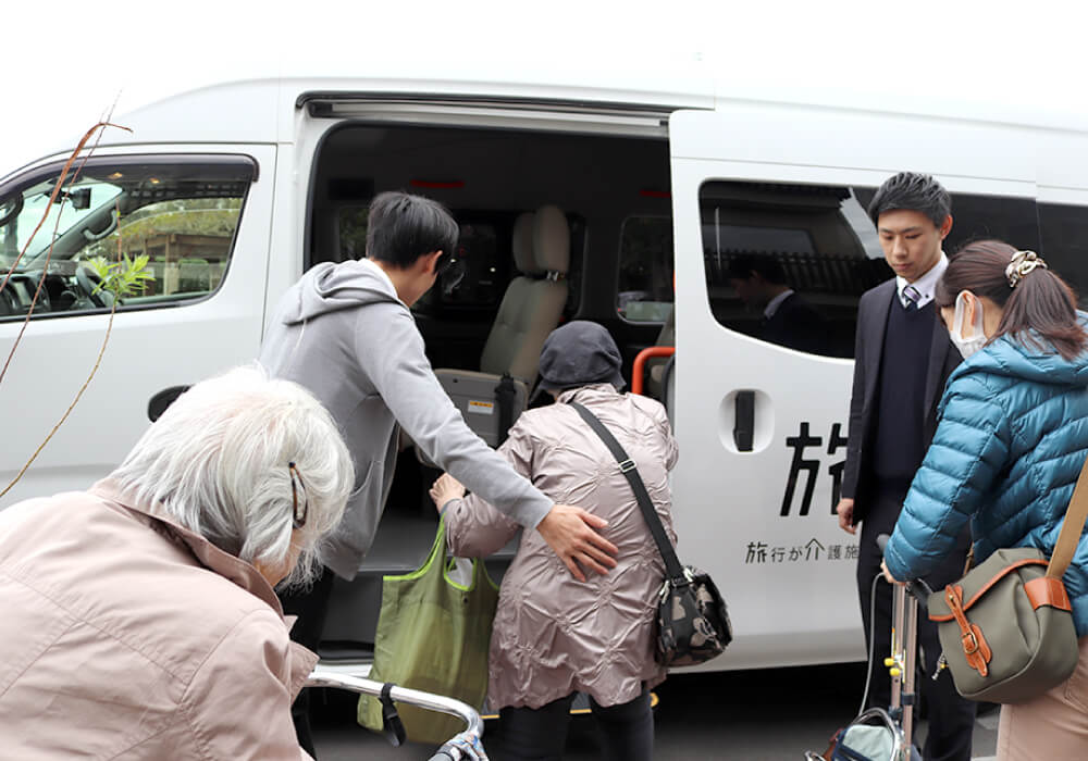 リフト付福祉車両を使用した少人数制の旅行サービスで、介護施設の外出レクリエーションの一環としてご利用者様・ご入居者様にご利用いただいております。介護施設の担当者は多彩なバリアフリーツアープランより、コースを選んで日付を決めるだけでOKです。あとは参加者を5名集めていただければ催行決定。旅行には、添乗資格はもちろんのこと、介護資格を有したスタッフがドライバーとして同行いたします。