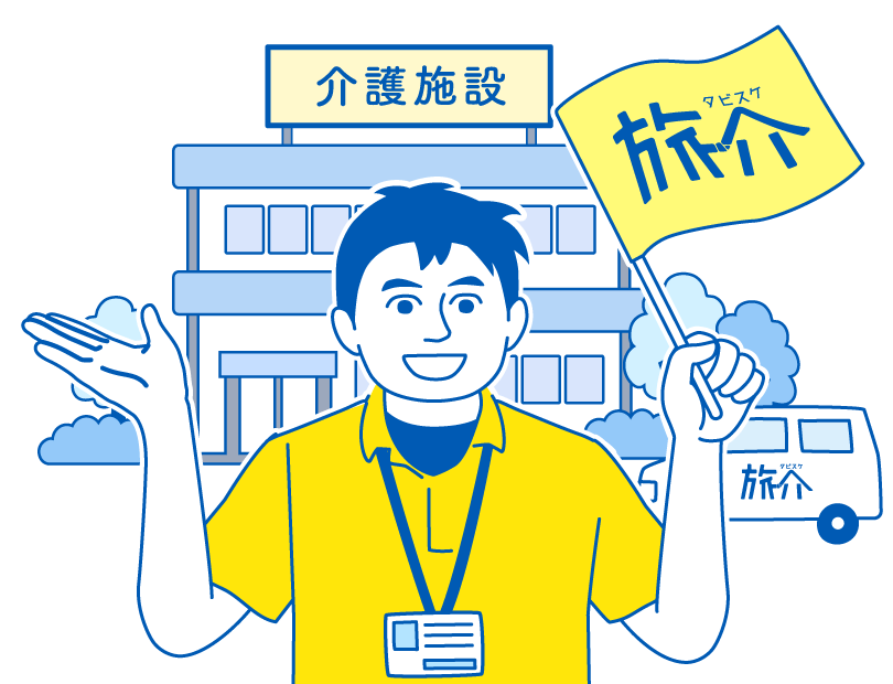 いよいよご出発です。出発時間に合わせて参加者をお集めください。元気いっぱいの旅介スタッフが施設を訪問させていただきます。特別な一日をお楽しみください。